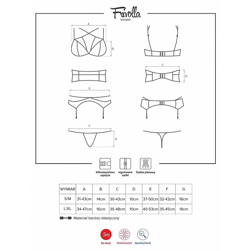 - Kitul conține patru piese admirabile cu un estetică unic și fermecător. - Sutienul din volănaș rafinată furnizează un alură subtil al bustului și are închidere reglabilă și bretele reglabile pentru o potrivire ușoară. - Unirea atrăgătoare de benzi elastice cu reglare vizuală pe decolteu adaugă un plus de stil. - Cureaua din dantelă cu balene verticale și închidere reglabilă accentuează talia într-un mod sexy. - Jartiera este ușor de reglat și are o bandă cocheta în jurul zonei șoldurilor. Produsul este făcut dintr-un material elastic si se potriveste marimilor S si M.