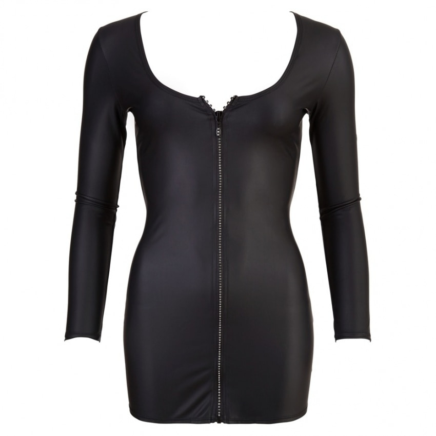 Rochia neagră mini, cu un braț lung, impresionează prin tăierea strânsă, care accentuează frumos și încântător curbele dvs. feminine, precum și un decolteu mare și un fermoar strălucitor în față.