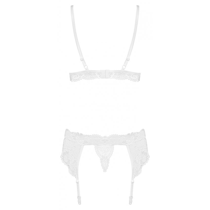 Set distins format din 3 componente din volănaș elastică albă cu motive florale. Kitul conține: sutien neîntărit, cu barete reglabile, centură și bikini asortat.