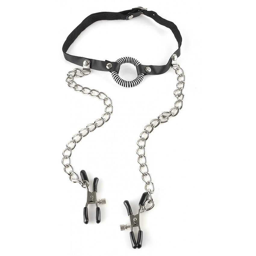 Căluș cu inel și două clame reglabile pentru mameloane acoperite cu cauciuc. Clamele sunt fixate de căluș cu 2 lanțuri metalice. Inelul călușului este confortabil fiind acoperit cu piele și se fixează cu susținerea a două curelușe din piele, astfel partenera este pregătită pentru cele mai perverse fetish-uri ale tale.