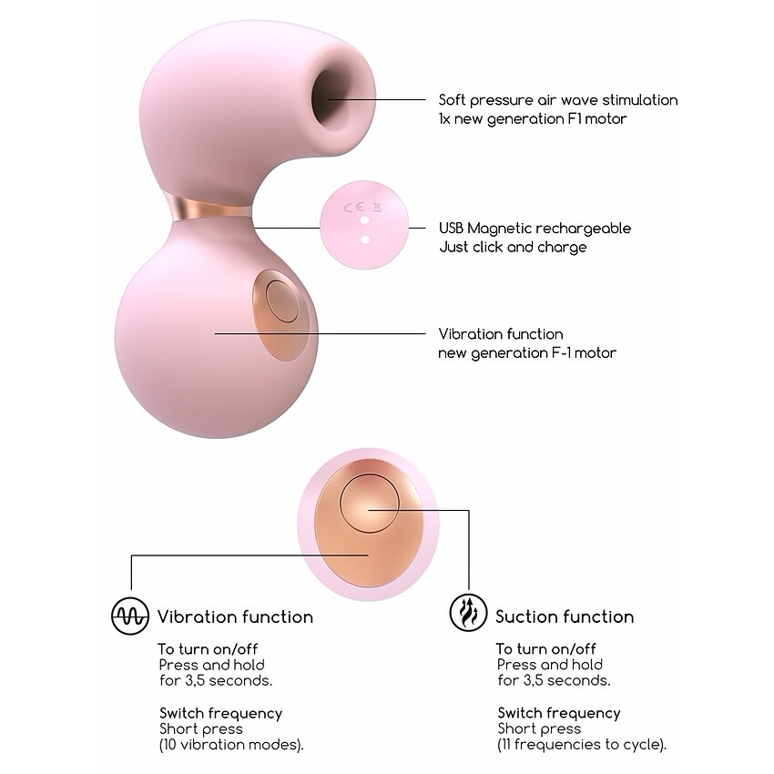 Stimulator pentru clitoris, cu configurație ergonomică, posedând 10 feluri de vibrații și o tărie de încărcare de 60 minute. Conține încărcător cu USB și este trainic la apă. Transmite 4500 de rotații pe minut.