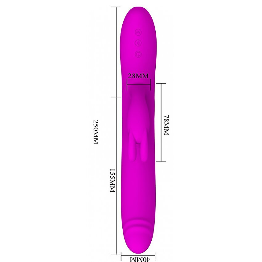 Uimitorul Vibrator Rabbit Pretty Love Byron cu dublă stimulare, este însușit cu un sistem de vibrații ce încorporează un strat de bile activatoare mobile, plasate sub siliconul părții sale inserabile, care efectuează mișcări sus - jos, cu patru feluri diferite. Cu susținerea acestui Vibrator Iepure Pretty Love Byron, masajul marginilor genitali, asociat cu vibrațiile pătrunzătoare va duce la climaxuri intense și multiple. Echipat cu două motoare puternice de vibrație, poate stimula simultan clitorisul și vaginul cu șapte moduri diferite de vibrații. Capul penian al vibratorului este bine definit, masând cu succes punctul G, iar stimulatorul pentru clitoris în formă de iepuraș, provoacă cu putere clitorisul. Vibratorul este creat dintr-un silicon medical igienic, neted și mătăsos. Este complet viguros la apă și se încarcă cu ajutorul încărcătorului cu USB, cu care este acompaniat în ambalaj. Lungime inserabilă: 15.5 cm.