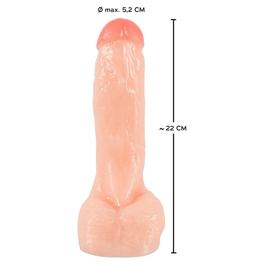 Dildo cu ventuză, mulaj al unui penis natural, ce respectă în totalitate detaliile originalului: gland, vene, scrot, flexibilitate. Material ce imită magistral pielea umană. Are ventuză ce îngăduie fixarea pe absolut orice suprafață plană (gresie, faianță, parchet etc), sau poate fi atașat chilotului pentru strap on.