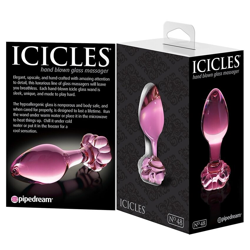 Vârful conic va face ușoară inserarea, în timp ce trunchiul va stimula intens pereții anusului. Conține și de o bază lată, sub configurație de floare care participă la păstrarea lui în siguranță între fese. Sticlă din care este realizat este hipoalergenică, neporoasă și, dacă este întreținut corespunzător, Icicles No. 48 a fost proiectat să țină o viață întreagă.