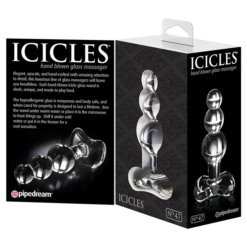 Icicles 47 este o jucărie anală elegantă, unică și este concepută pentru a fi rezistentă la cele mai dure jocuri! Perfect pentru jocul anal, acest Anal Plug Sticlă Icicles No 47, are vârful conic, particular creat pentru inserare ușoară, în timp ce bilele suprapuse cu diametre crescătoare, va dezvoltă stimularea palpitantă.