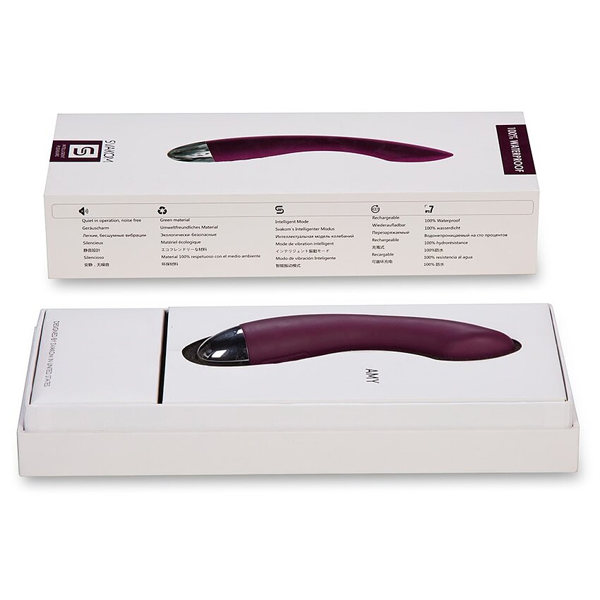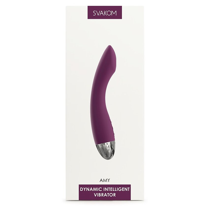 Vibrator Amy de la Svakom, este un vibrator elegant, neted, rezistent la apă și cu 6 moduri de vibrație și pulsație. Din cauza formei sale poate stimula cu ușurință punctul G. Are 5 feluri + 1 mod inteligent Svakom.