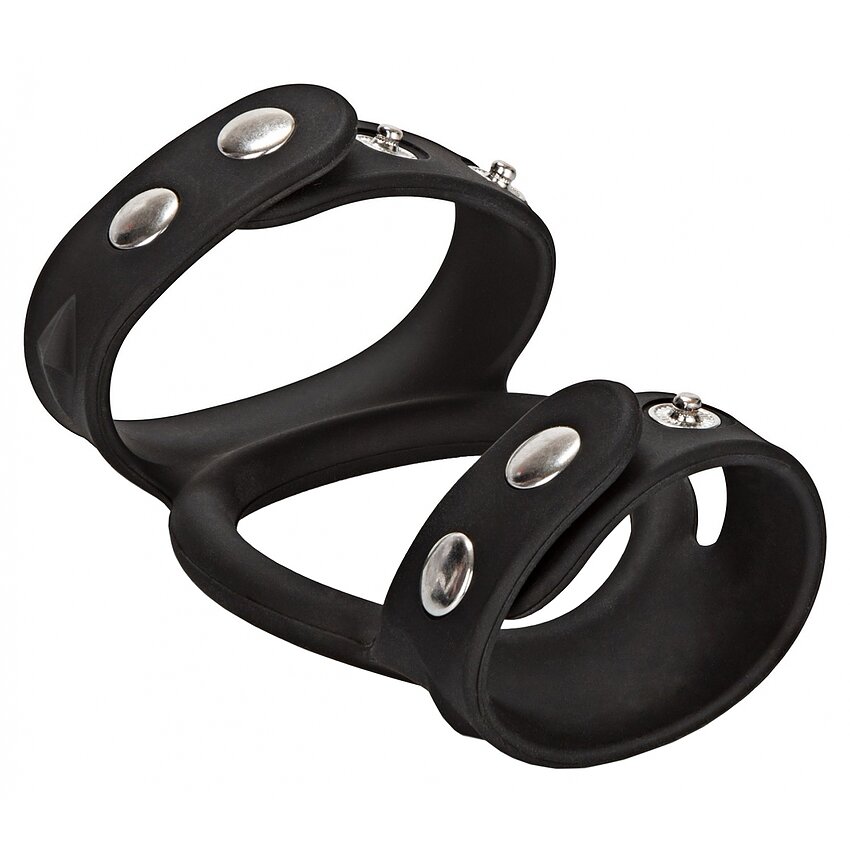 SILICONE TRI-SNAP C & B CAGE este un inel erecție din silicon, elastic și confortabil. Este moale, neted și foarte rezistent. Este perfect ajustabil cu capse tip curea. Suport triplu de prindere - un inel în față testiculele, unul cuprinde testiculele și celalalt în spatele testiculelor.