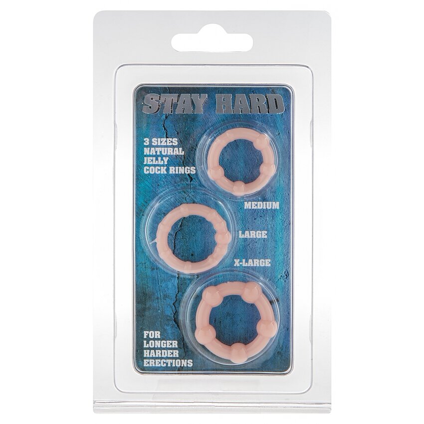 Set 3 Inele Penis Stay Hard - îmbunătățește-ți performanța carnală cu acest set de inele. Fabricate dintr-un material confortabil și deosebit de elastic, acestea se adaptează perfect. În colorație naturală, furnizează o experiență cât mai autentică.