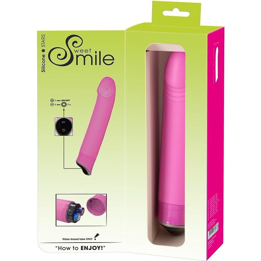 Vibrator Smile Happy cu capul bine conturat pentru amplificarea plăcerii. Din silicon fin, ultra silențios, cu 7 ritmuri de pulsații reglabile în tărie cu ajutorul butonului One touch-o singură mângâiere cea ce vă permite să modificați vitezele excluzând să luați degetul de pe buton, deținând astfel probabilitatea să vă concentrați în totalitate asupra plăcerii primite. Materialul finit utilizeaza 2 baterii in format AA care vor fi cumparate impreuna cu acest produs.