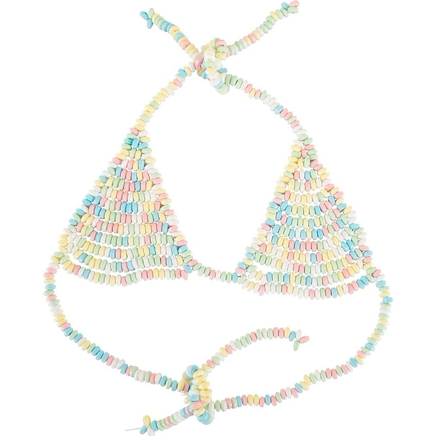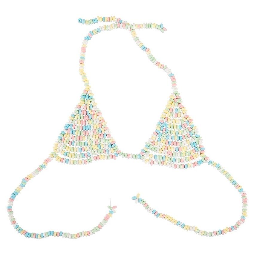 Acest bustieră fabulos este realizat din sute de bombonele cu arome fructate, exact la fel ca și colierele și brățările din bombonele pe care le cumperi de la magazinul de dulciuri.