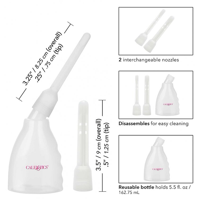 - Rezervorul de apă este transparent, permițând utilizatorului să vadă cantitatea de lichid disponibilă în orice moment. - Capetele interschimbabile au lungimi de aproximativ 12 cm și diametre de 1,3 cm și 1 cm. - Așezarea capetelor se face prin înfiletare, garantând o utilizare sigură și stabilă. - Duzele au jeturi laterale pentru o ștergere completă a zonelor intime. - Sistemul este simplu de demontat, facilitând purificarea rapidă și ușoară după fiecare utilizare.