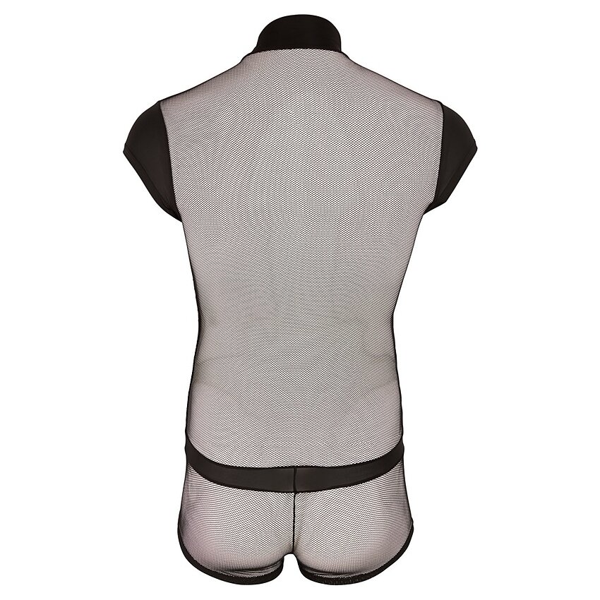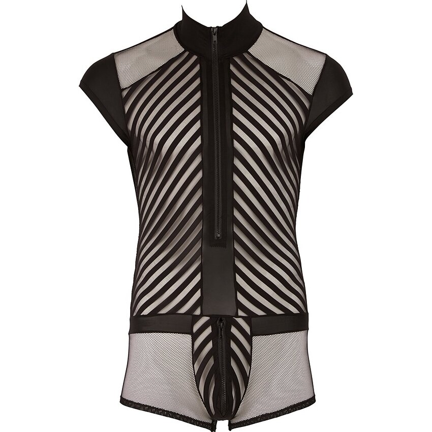 Body Overall negru pentru masculi din 2 substanțe variate ce creează un design deosebit dintr-o structură de linii. Cu fermoar în față și în zona intimă.