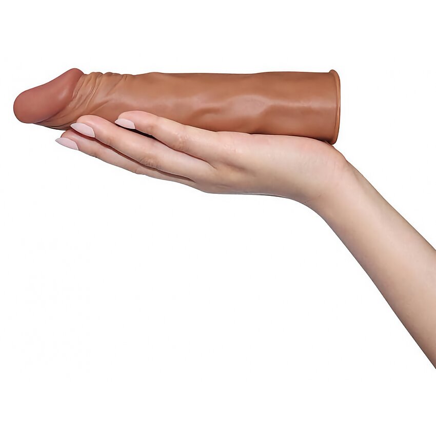Are o lungime totală de 18.5 cm și un diametru de 4.3 cm. Pe interior, are o extindere de 14 cm și un diametru de 3 cm. Dacă prolungatorul e prea mare, îl poți decupa pentru a fi la măsura corespunzătoare pentru penisul tău.