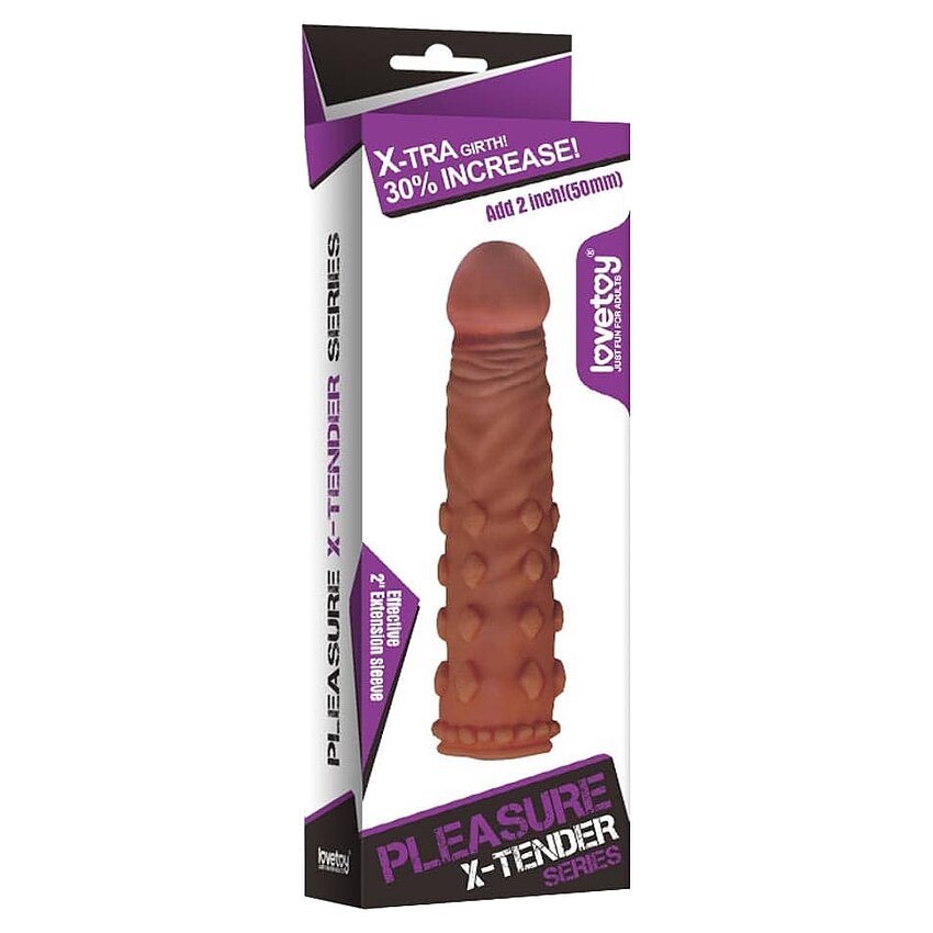 Manșon extra realist ce prelungește penisul cu 5 cm în mărime și cu 30% în grosime. Cap realist, material moale și flexibil. Conține noduli pentru stimularea partenerei. Are cap subțire pentru o introducere ușoară. Mărește-ți dimensiunea falusului utilizând extensia Pleasure X-tender. Fiind realizat dintr-un material ultra-realistic, se simte exact ca dermă umană. Suprafața externă este texturată cu vene proeminente, iar glandul este bine conturat. Astfel, poți fi sigur că partenera ta va avea parte de senzații deosebite, deoarece vaginul ei va fi puternic stimulat. Manșonul se poate ajusta în funcție de dimensiunea penisului. Grosimea membrului va crește cu 30%.