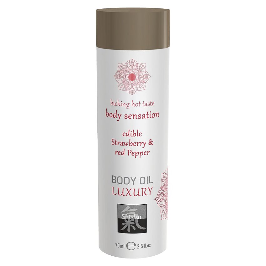 Bucurați-vă cu toate simțurile! Ulei de masaj cu un parfum rafinat de căpșuni și ardei roșu și gust care stimulează simțurile și trezește vibrațiile erotice. Uleiul de frecție este perfect corespunzător pentru jocuri și explorări orale.