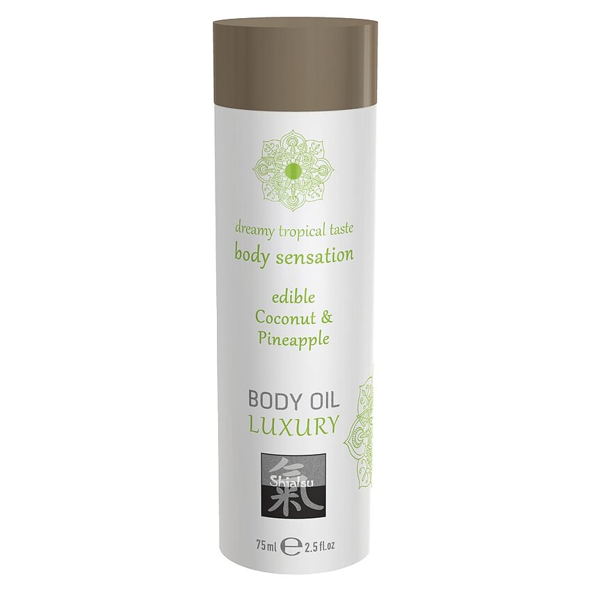 Bucurați-vă cu toate simțurile! Ulei de masaj cu un mireasmă exotic de nucă de cocos și ananas și gust care surescitează simțurile și trezește vibrațiile erotice. Uleiul de masaj este sublim potrivit pentru jocuri și explorări orale.