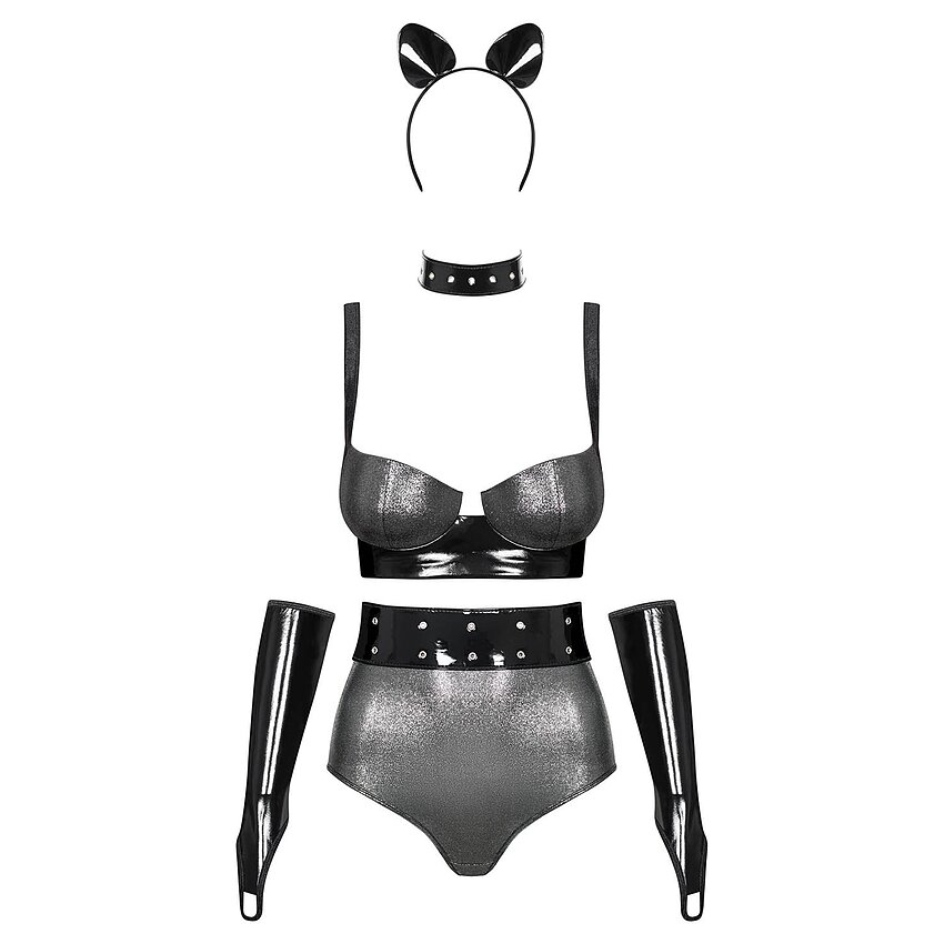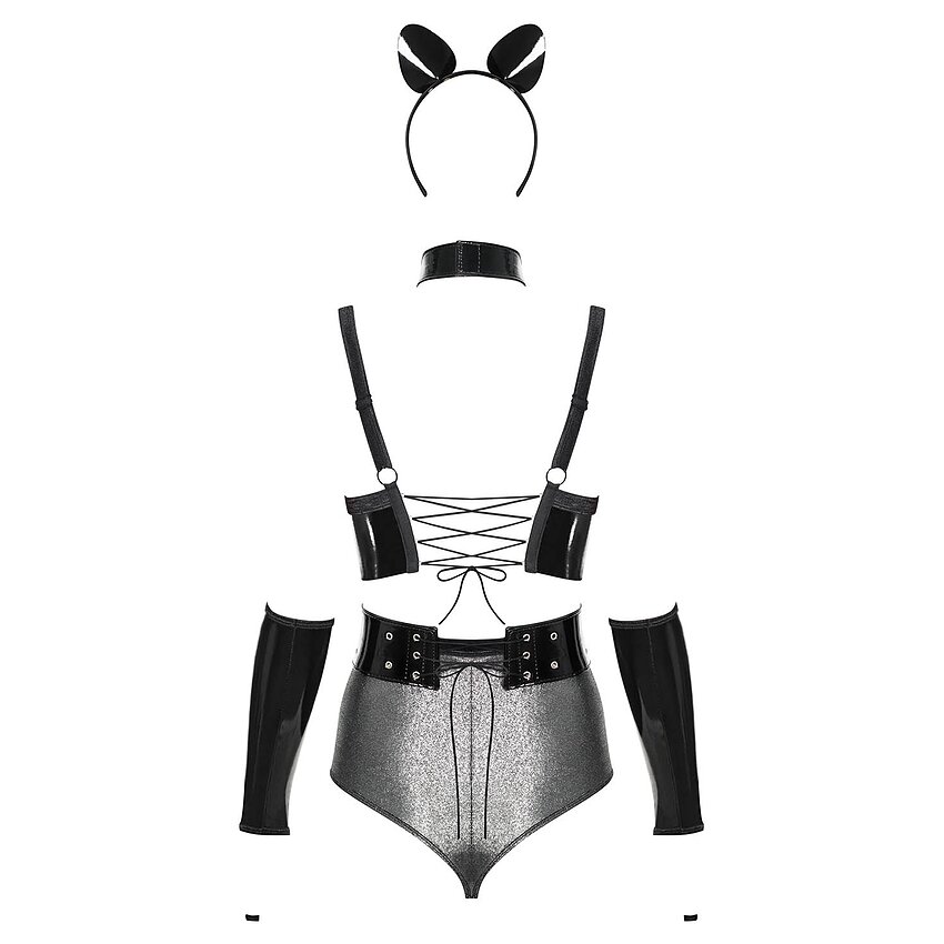 În seara asta dezlănțuie felină din tine! Acest Costum Pisicuță Obsessive Silveria Gri incitant este confecționat din material elastic în combinație cu material lucios. Sutienul are cupele întărite, bretelele sunt ajustabile și se închide la spate cu susținerea unui șnur.