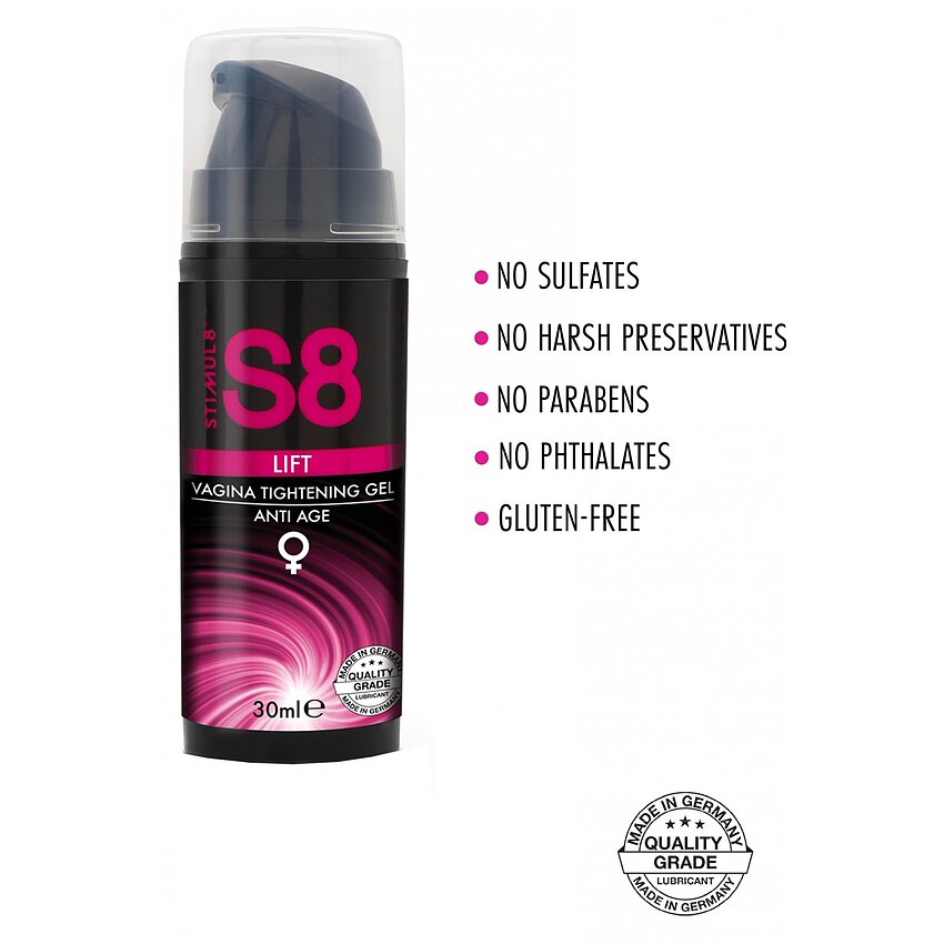 S8 Tightening Lift este un gel 2in1 pentru strâmtarea și întinerirea dermei vaginului, făcându-l mai ferm și mai atrăgător. Această unguent are un efect garantat din pricina ingredientelor naturale din care este fabricată, componente utilizate des și în cremele de lux pentru rejuvenare facială. Cafeină încetinește îmbătrânirea țesuturilor și conferă fermitate zonelor intime, în timp ce lipopeptidele stimulează circulația sângelui pentru a crește trăirile de plăcere și a intensifica orgasmul.