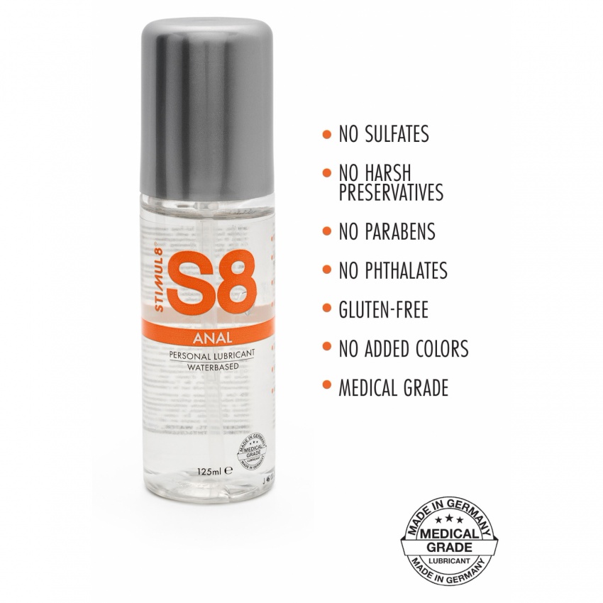 Noul lubrifiant S8 Waterbase Anal oferă o glidare indulgentă, de întinsă durată, perfect pentru aventuri anale! Formula de calitate este dezvoltată pentru a asigura cea mai catifelat atingere, fiind în același timp delicat cu dermă și membranele intime. Acest lubrifiant de excepție este fără gluten, fără sulfat, lipsit de paraben, minus ftalat și nu are și conservanți duri sau nuanțe adăugate. Cu aprobarea de calitate medicală, lubrifiantul autentic S8 Waterbase Anal aderă, de asemenea, la toate reglementările actuale ale UE privind articolele de îngrijire intimă și face o alternativă de încredere.