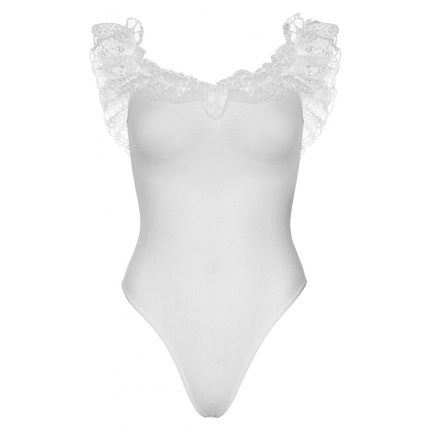 Marime: XS-L Culoare: Alb Material: 90% Poliamidă, 10% Elastan Livrare: Confidențială Nu se poate usca în uscător Nu poate fi dus la curățătorie Nu poate fi folosit fierul de călcat Ambalaj de lux Are închidere inghinală Se poate spăla doar manual Model cu dantelă Acest produs nu se poate înălbi Model căzut de pe umeri Brand: Leg Avenue