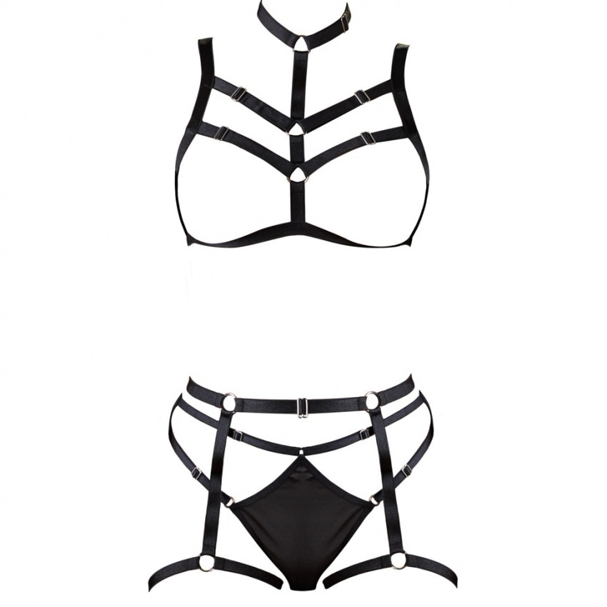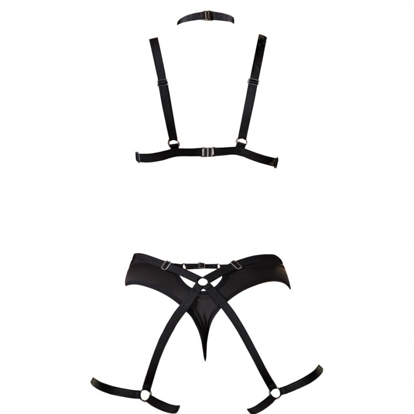 - Kitul conține un ham decorativ care poate fi purtat pe coapse și talie, subliniind silueta. - Designul senzual al sutienului deschis este completat de legături metalice. - Breteluțele sunt moi și elastice, încrezând un confort sporit. - Tanga are o croială în înfățișare de romb în față și un decupaj îndrăzneț în spate. - Breteluțele sunt ajustabile pentru o potrivire perfectă. - Setul emană o ambianță de bondage fierbinte, fiind atât elegant cât și obraznic. Bunul este fabricat dintr-un material flexibil si se potriveste marimilor S, M si L.