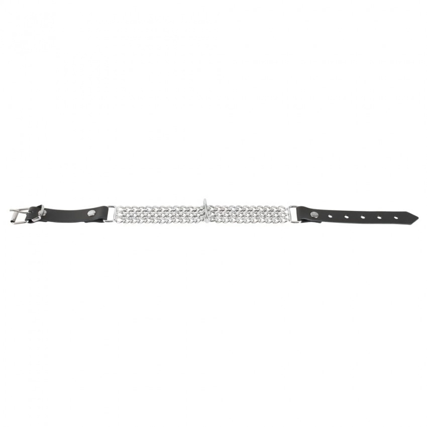 Guler pentru gât, întunecat cu trei lanțuri metalice la care se poate fixa o lesă. Închidere reglabilă cu cataramă.