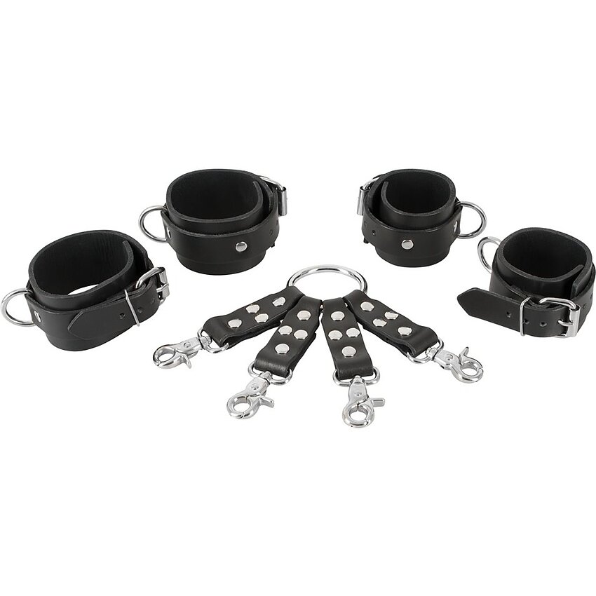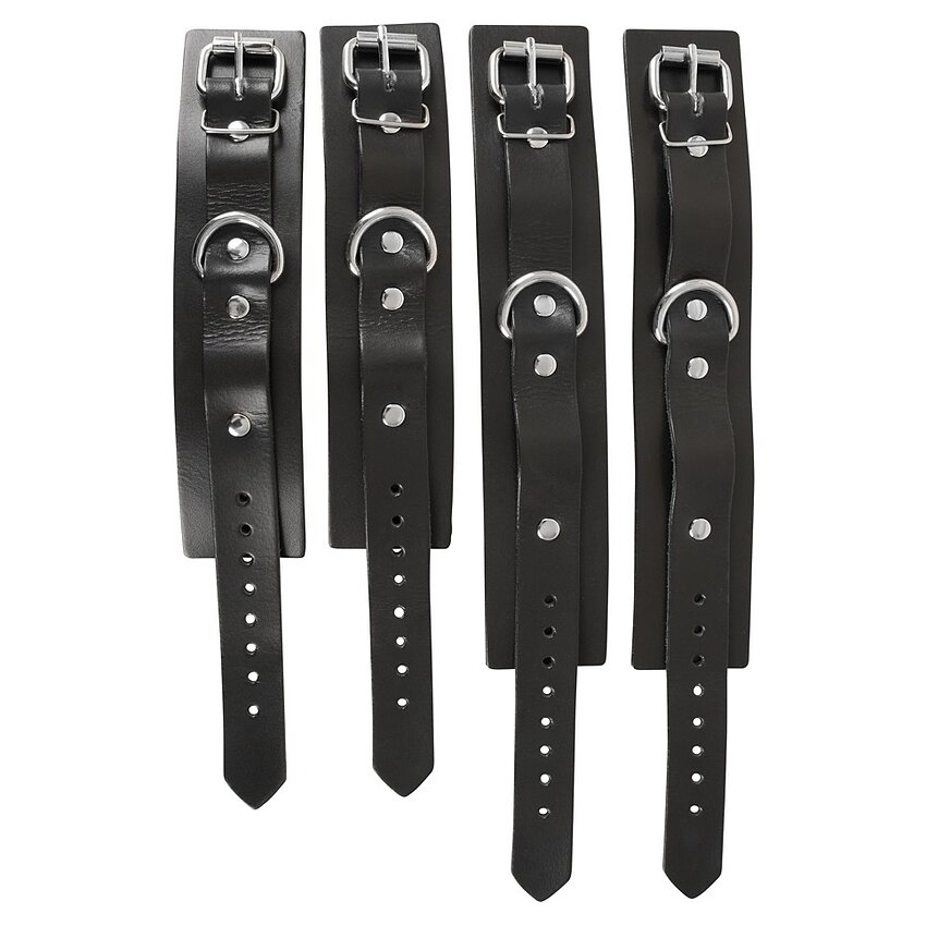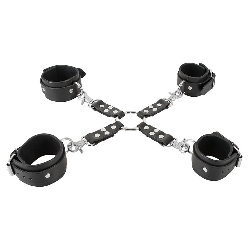 Set bondage pentru iubitorii de robie! Cătușele și manșetele gleznei sunt netede în interior și sunt, de asemenea, decorate cu știfturi, la fel ca crucea de conectare inclusă.