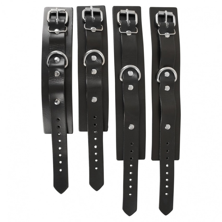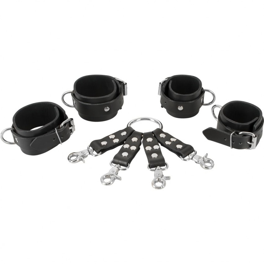 Set bondage pentru iubitorii de robie! Cătușele și manșetele gleznei sunt netede în partea interioară și sunt, de asemenea, decorate cu știfturi, la fel ca crucea de conectare inclusă.