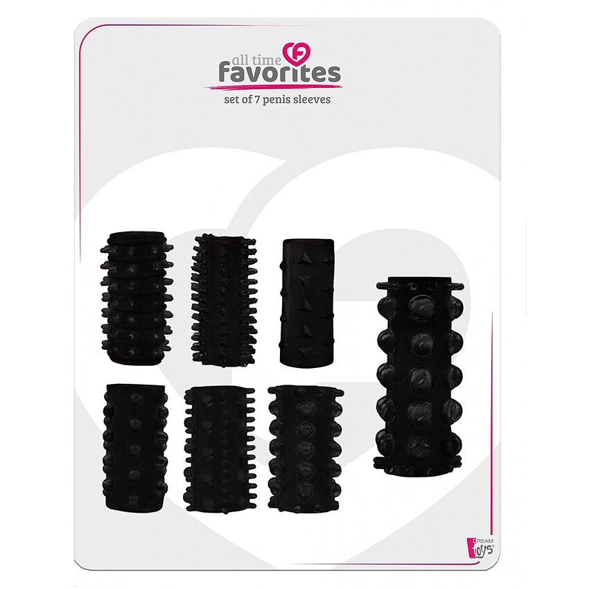 Acest set de 7 manșoane pentru falus din etichetă All Time Favorites are 7 texturi diferite. Sunt întinse și, datorită potrivirii lor strânse, funcționează ca un inel al falusului pentru sculări mai dure și mai durabile, în timp ce textura stimulează în momentul acțiunii sexual.