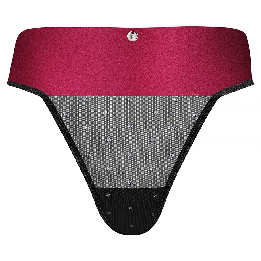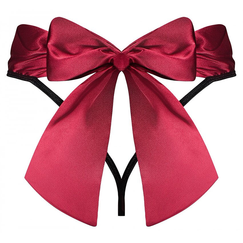 Bikini cu ață răpitoare cu fundiță roșie portjartier de satin seducătoare și atrăgătoare, care accentuează șoldurile un pandantiv din argint - strălucește frumos și îmbogățește un aer jucăuș materialul negru delicat se lasă să se vadă prin el punctele picante și strălucitoare te invită la joacă material satisfăcător la atingere, extrem de elastic. Materialul finit este fabricat dintr-un material elastic si se potriveste marimilor L si XL.