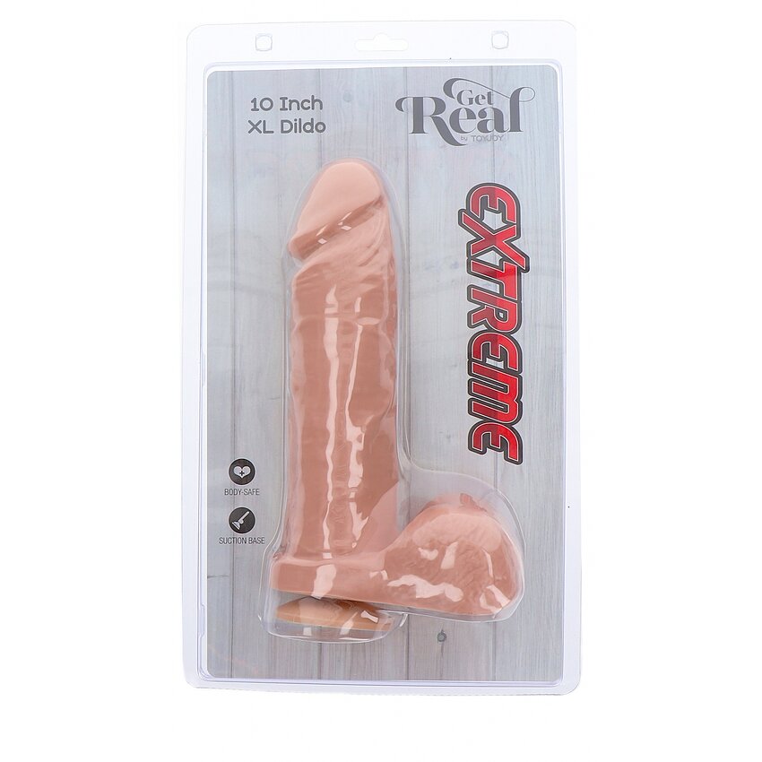 Dildo cu Ventuză XL 10 Inch este un dildo premium, din colecția Get Real by TOYJOY, conceput pentru a vă atinge toate punctele fierbinți intime. Acest dildo simpatic are o tentă naturală a pielii, 2 testicule și o ventuză care permite jucăriei să se flexeze în funcție de cum doriți, oferindu-vă o experiență palpitantă cu membrele libere. Designul cuprinde detalii elaborate cu atenție, cum ar fi venele și bilele, pentru a spori atractivitatea sa naturală.