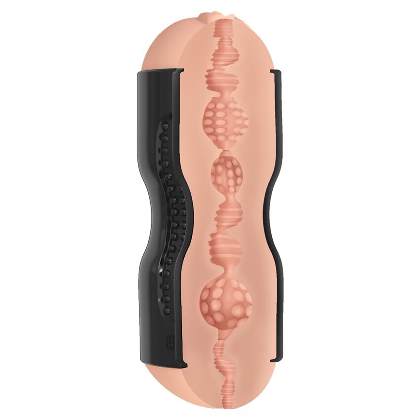 - Laturile masturbatorului pot fi strânse pentru a intensifica presiunea asupra penisului, ceea ce crește și efectul de aspirație. - Utilizatorul poate alege între un orificiu vaginal catifelat sau un anus strâns. - Manșonul moale și realist cu textura sa extrem de puternică incită cu adevărat penisul.