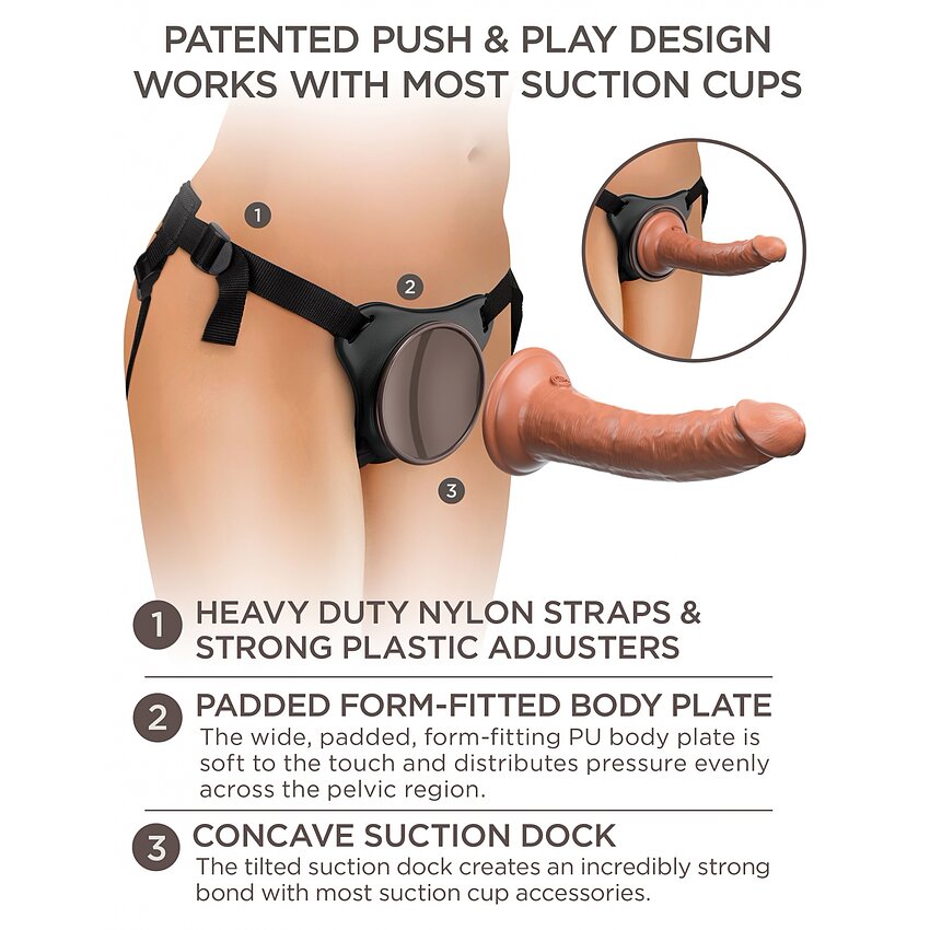 Kitul Comfy Silicone Body Dock de la King Mădular Elite este alcătuit din hamul cu centuri Comfy Body Dock și dildo-ul foarte realist 7 Dual Density Silicone Penis pentru distracție nelimitată.