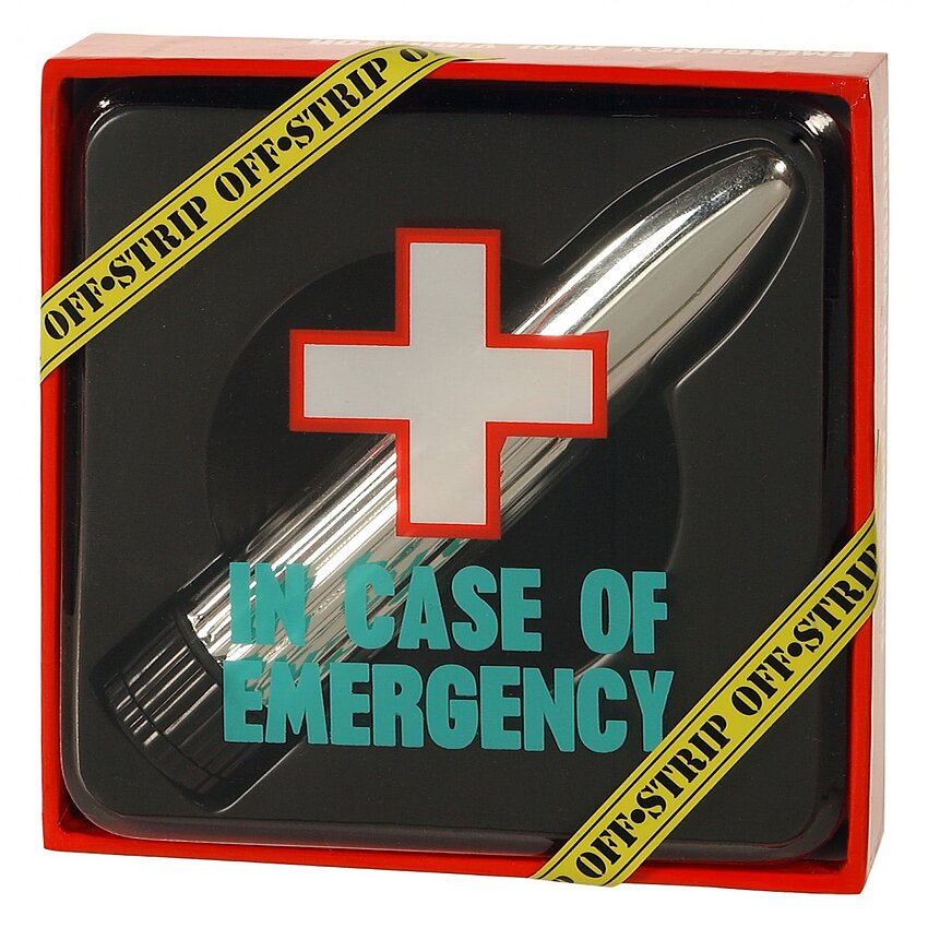 Un adevărat vibrator ambalat într-o cutie de carton în stilul alarmelor de incendiu tradiționale In case of Emergency