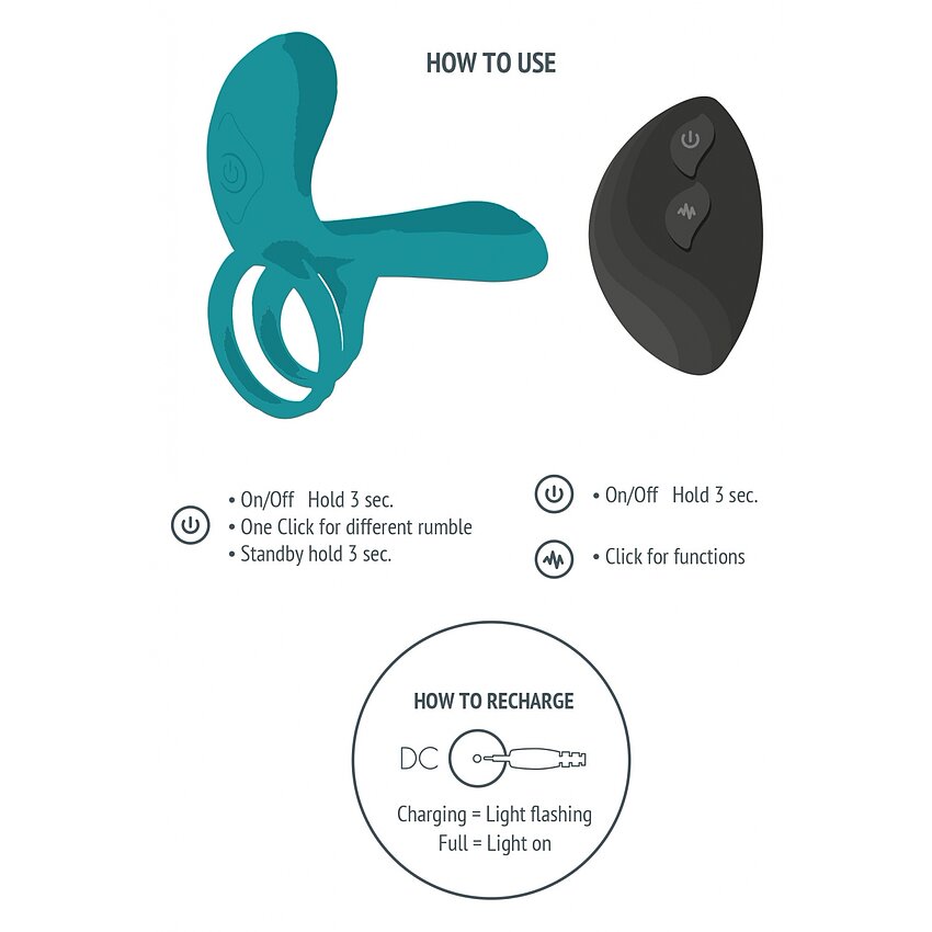 Inelul vibrator are 2 motoare de putere, foarte silențioase, și este însușit cu 7 funcții de vibrații și 2 trepte de viteză. Stimulatorul pentru clitoris este realizat din striații de silicon medical care crește plăcerea. Extensia inelului este suficient de întinsă pentru a penetra complet și pentru a atinge punctul G.
