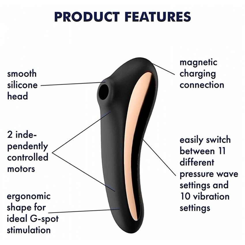 Pe alături stimularea clitorisului cu undele sale de presiune pulsante, Dual Kiss poate fi întrebuințat și pentru un masaj stimulant al punctului G cu brațul ușor curbat. 11 intensități ale undelor de apăsare și 10 setări de vibrații sunt disponibile pentru a-ți satisface toate dorințele.