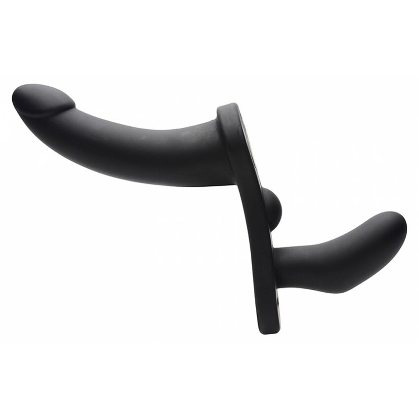 Plasați dildo-ul mai lung prin orificiul hamului minimalist, permițând purtătorului să introducă partea mai mică, care este curbată pentru a ajunge la punctul G.