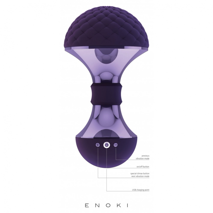 Prins confortabil în mână întrebuințând o bază rotunjită, vârful circular cu acoperire integrală a lui Enoki înconjoară cu ușurință clitorisul, sfârcurile, penisul și numeroase alte posibile alte zone erogene. O textură subtilă de tip fagure și o suprafață unică de plus se combină cu zece moduri de vibrație constantă, pulsatorie și crescătoare, în timp ce gâtul elastic se îndoaie pentru a se potrivi aproape oricărei poziții.
