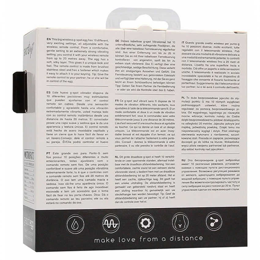 Acest ou mare lipsit de fir punct G are 10 setări diferite, foarte interesante, toate reglabile cu tele-comandă fără fir. De la o poziție confortabilă, blândă la o poziție vibrantă extrem de puternică; îl controlezi cu telecomandă wireless de la până la 20 de metri distanță.