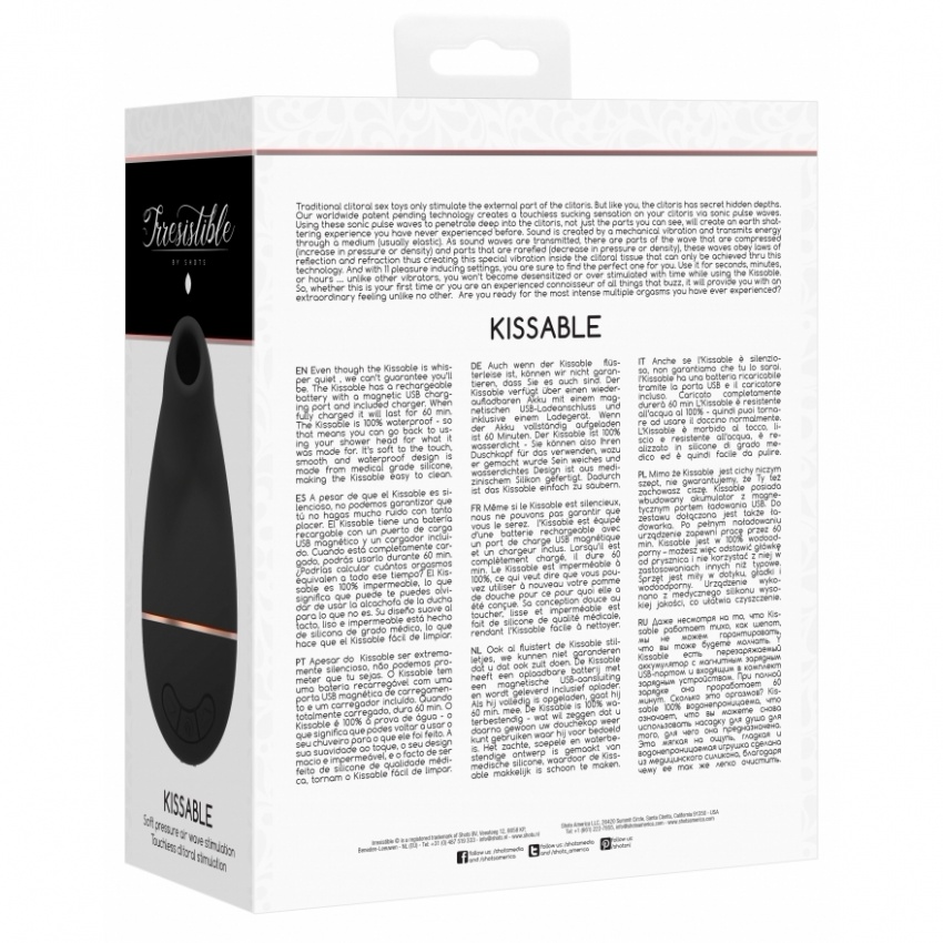 Vibrator Clitoridian Kissable va înconjoară clitorisul minus să-l atingă și îl supraexcită prin valuri de aer de presiune moale, care alcătuie o vibrație unică care pătrunde în țesut, care nu poate fi obținută lipsit de utilizarea acestei tehnologii.