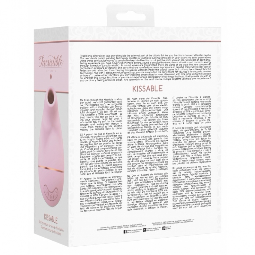 Vibrator Kissable Irresistible va înconjoară clitorisul excluzând să-l atingă și îl stimulează prin valuri de aer de apăsare moale, care creează o vibrație unică care pătrunde în țesut, care nu poate fi obținută fără utilizarea acestei tehnologii.
