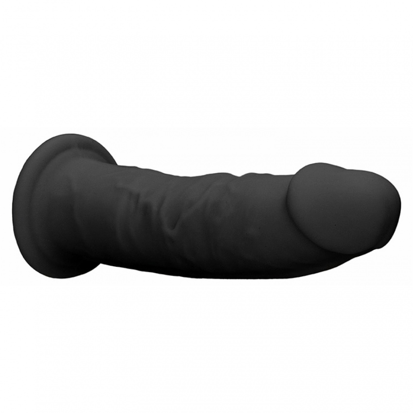 Realrock Din Silicon 19.2cm închis la culoare dă o senzație de calitate premium din pricina suprafeței de silicon și interiorului cu densitate dublă. Se distinge prin flexibilitate și o densitate superioară, permițând adaptarea după dorință. Când este încălzit (max 30s la microunde/2min în apă fierbinte) devine mai moale, iar răcit în frigider, mai dur. Vine cu o ventuză puternică.