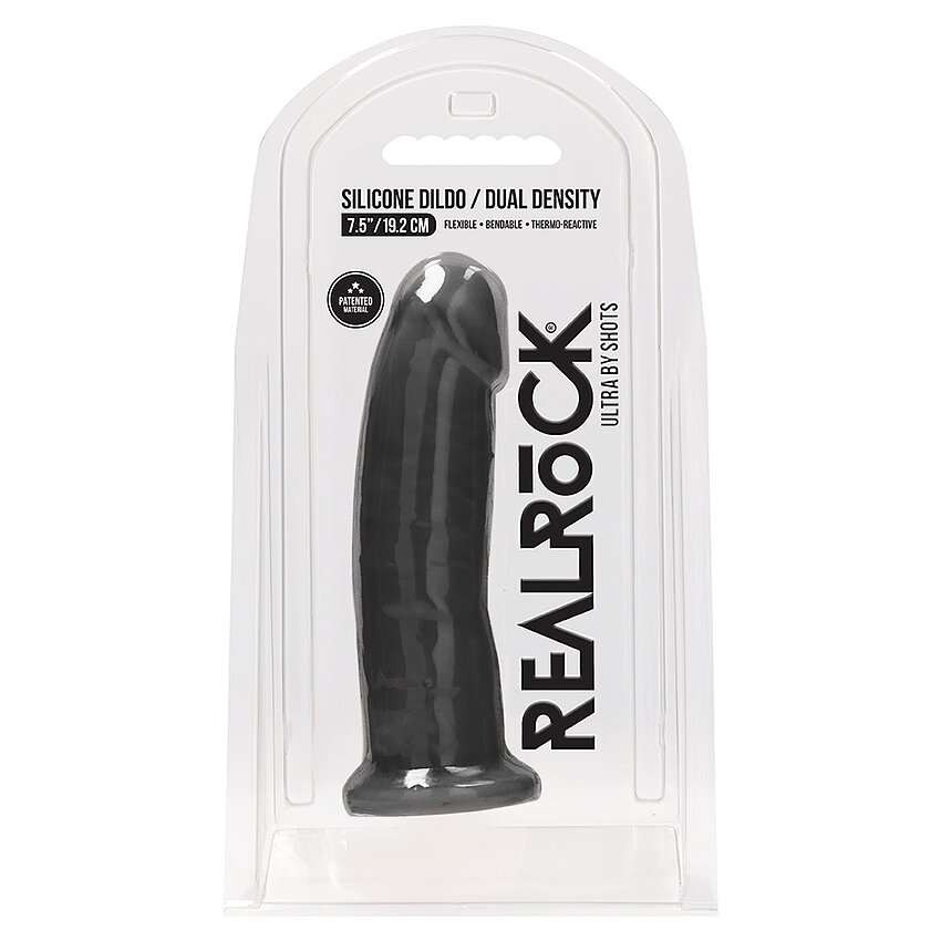 Realrock Din Silicon 19.2cm Negru dă o senzație de excepție de lux datorită suprafeței de silicon și interiorului cu densitate dublă. Se distinge prin flexibilitate și o densitate superioară, permițând adaptarea după dorință. Când este încălzit (max 30s la microunde/2min în apă fierbinte) devine mai moale, iar răcit în frigider, mai dur. Vine cu o ventuză puternică.