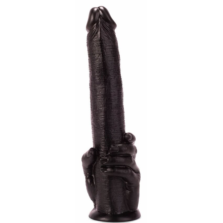 Mâna care prinde un dildo gigant, realizat dintr-un material cu o senzație asemănătoare cu pielea, similară cu țesutul corpului și cu o regiune cu vene.