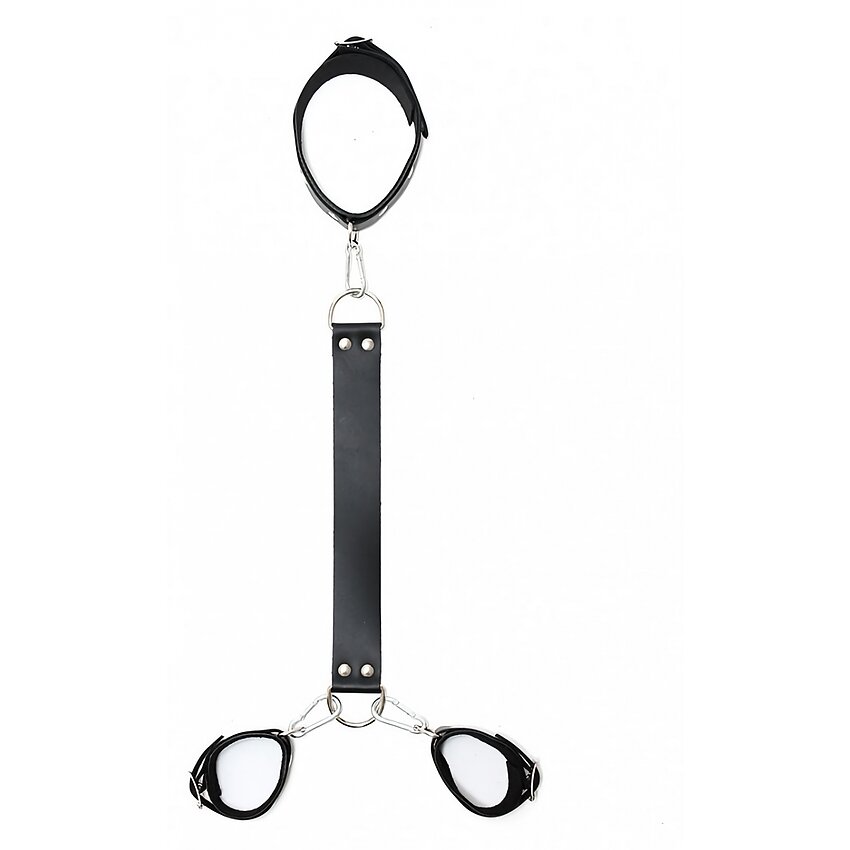 Rimba Bondage Play – guler din piele normală pentru gât, alipit de cătușe pentru membre cu catarame metalice, unite printr-o curea de piele; sunt incluse și carabiniere.