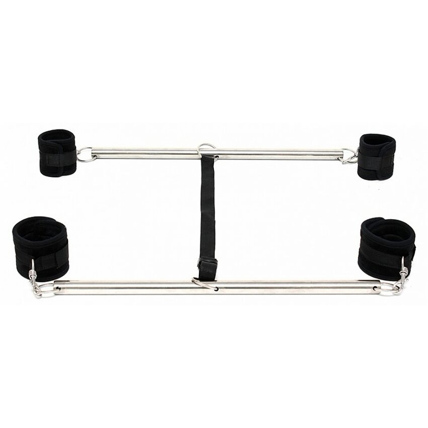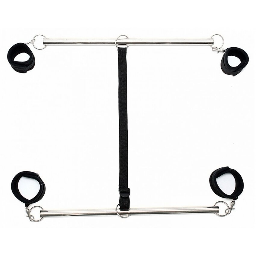 Stăpânește-ți partenerul cu această bară dublă pentru brațele și picioarele. Are două bare metalice cromate conectate la o cingătoare reglabilă. Atât manșetele încheieturilor, cât și ale gleznelor sunt moi, dar puternice, astfel încât să fie confortabile în timp ce sunt distractive și au cârlige, astfel încât să le puteți folosi excluzând a fi necesitate de bare. Puteți regla distanța dintre cele două bare din cauza cataramei care poartă una dintre curele.