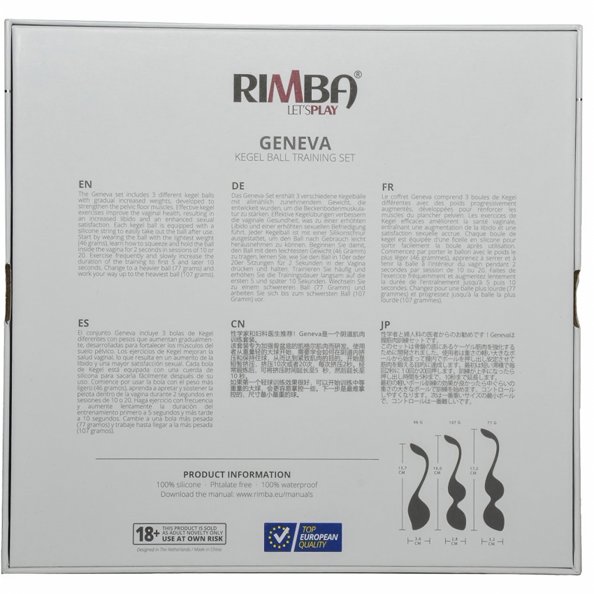 Setul Geneva conține 3 bile Kegel variate cu greutăți crescute treptat, dezvoltate pentru a întări mușchii pelvieni. Exercițiile Kegel eficiente îmbunătățesc sănătatea genitală, rezultând o creștere a libidoului și o satisfacție carnală sporită. Fiecare minge Kegel este echipată cu o sfoară de silicon pentru a scoate ușor mingea după utilizare.