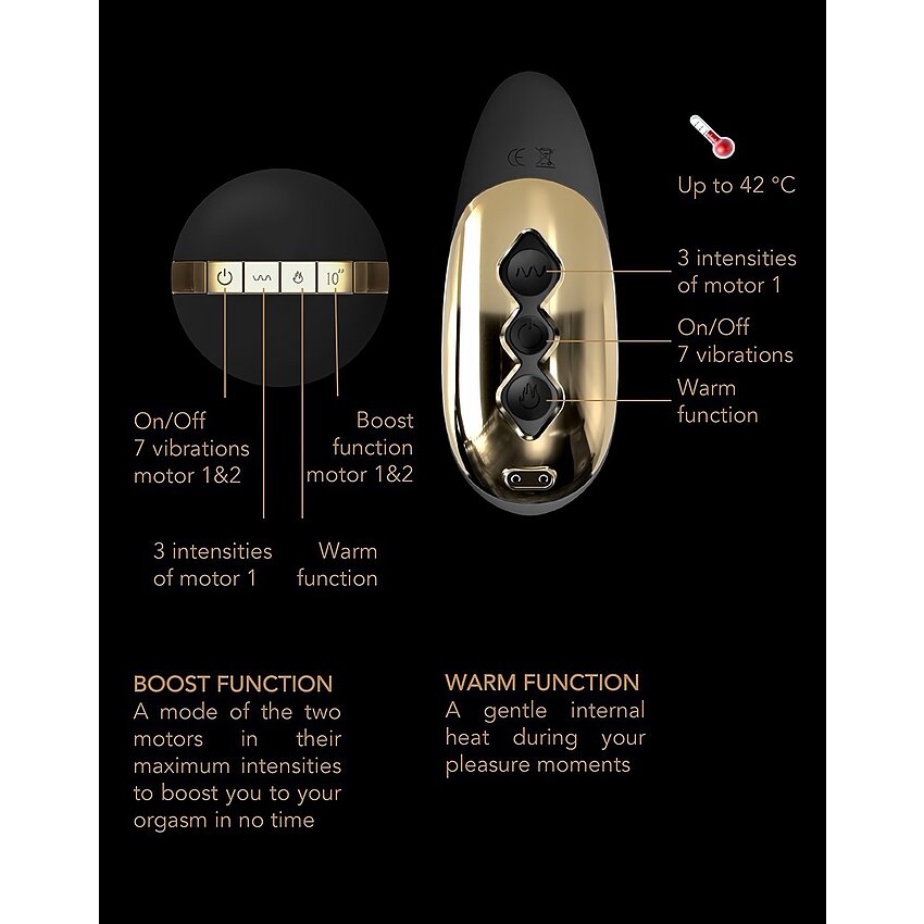 Funcția de boost este un mod specific în care motoarele folosesc intensități maxime pentru a stimula un orgasm. Funcția de încălzire (până la 42 de grade) oferă o căldură ușoară în umplută luptă.