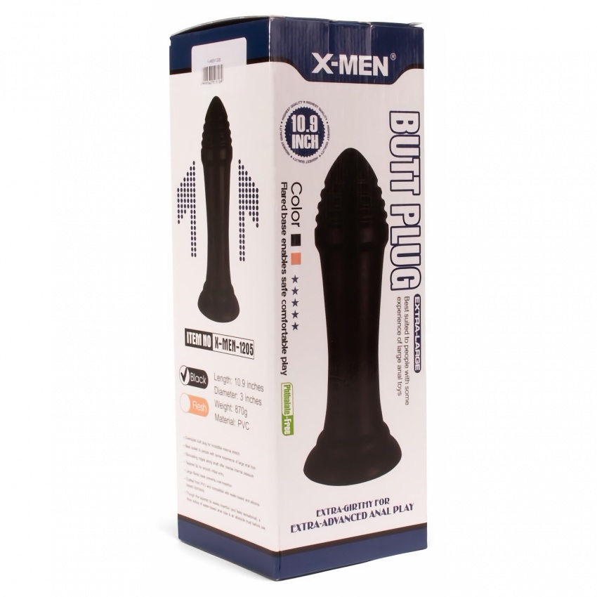 X-Men Advanced Girthy este un anal plug din PVC de culoare neagră ce are 27.7 cm extindere și 7.6 cm în diametru. Este însușit cu o ventuză puternică, cu susținerea căreia poți lipi jucăria de indiferent ce suprafață, pentru a o folosi fără mâini.