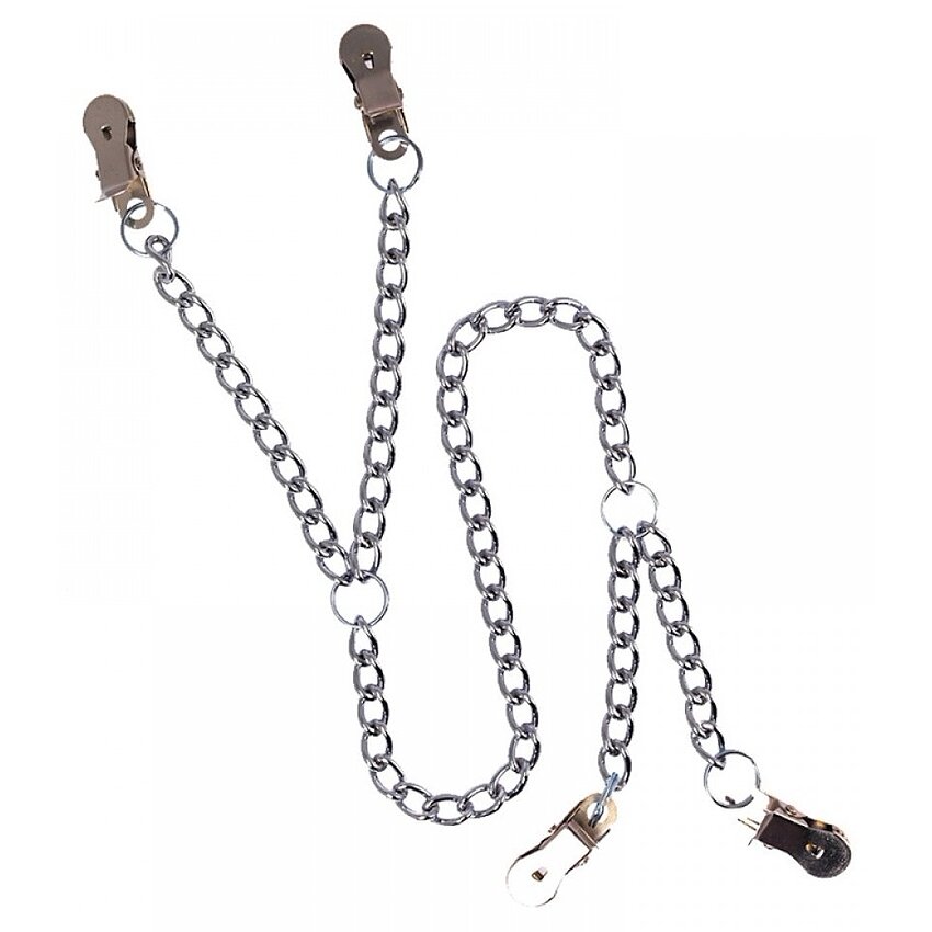 - Setul include patru cleme care conectează sfârcurile și labiile printr-un lanț. - Desăvârșit pentru nopți BDSM minus limite.